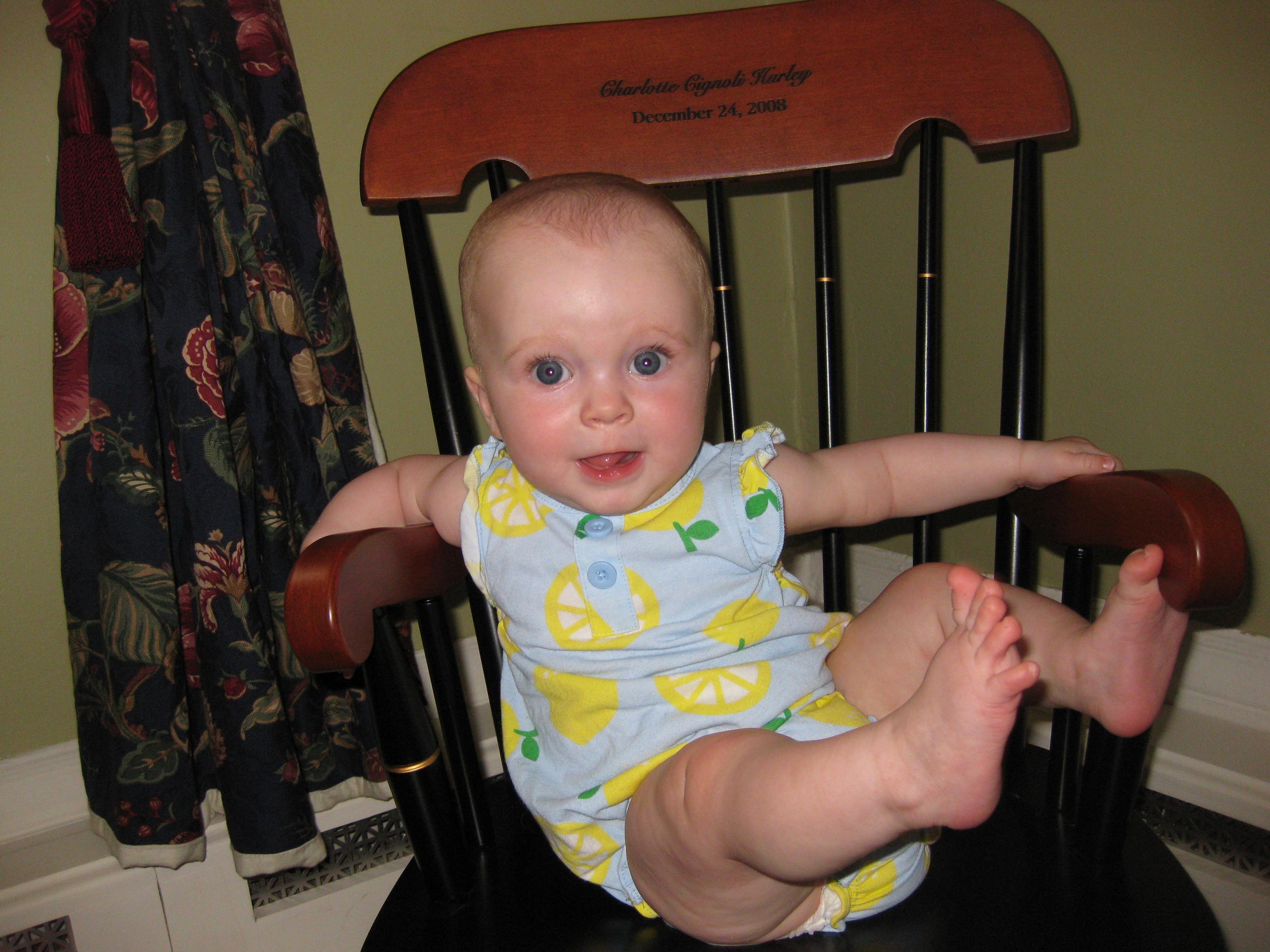 Charlotte has green beans on her face here. She didn’t like them at first, but the taste seems to have grown on her. She really likes sweet potatoes and apples. Peaches are really not a big hit–I used the frozen kind and cooked and mashed them, but I think maybe they are too tart for her liking.